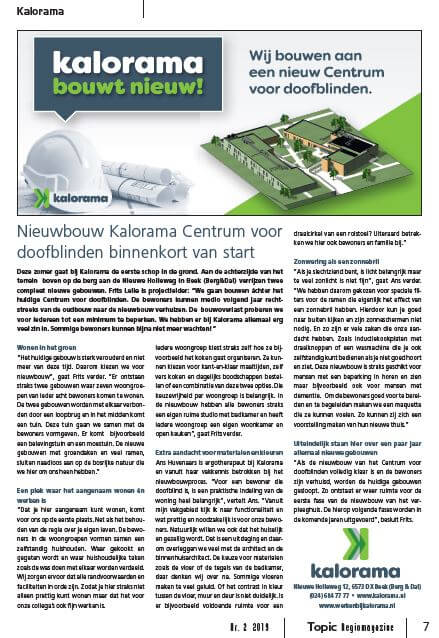 Deze en vorige week valt de TOPIC weer op de deurmat in de complete gemeente Berg en Dal. Dit keer staat er een artikel in over de nieuwbouw van het Centrum voor doofblinden. De nieuwbouw gaat binnenkort van start. Onze collega Frits Lelie is projectleider en vertelt in het artikel: “We gaan bouwen áchter het huidige Centrum voor doofblinden. De bewoners kunnen medio volgend jaar rechtstreeks van de oudbouw naar de nieuwbouw verhuizen. De bouwoverlast proberen we voor iedereen tot een minimum te beperken. We hebben er bij Kalorama allemaal erg veel zin in. Sommige bewoners kunnen bijna niet meer wachten!”